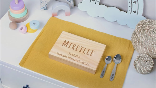 Les couverts pour enfants sont livrés dans une jolie boîte en bois, qui peut également être personnalisée. Vous pouvez y indiquer le nom, ainsi qu'une date et un texte personnel. Grâce à cette personnalisation, les couverts pour enfants sont idéaux comme cadeau original pour l'enfant, par exemple à l'occasion d'une naissance ou d'un baptême, d'un anniversaire ou de Noël.