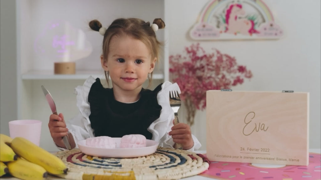 Les couverts pour enfants sont livrés dans une jolie boîte en bois, qui peut également être personnalisée. Vous pouvez y indiquer le nom, ainsi qu'une date et un texte personnel. Grâce à cette personnalisation, les couverts pour enfants sont idéaux comme cadeau original pour l'enfant, par exemple à l'occasion d'une naissance ou d'un baptême, d'un anniversaire ou de Noël.