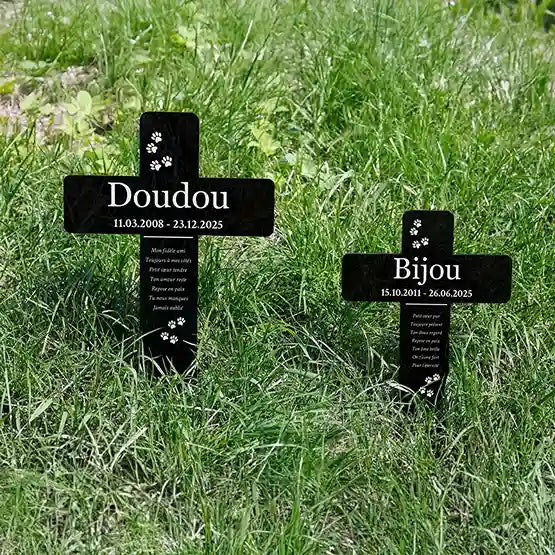 Offrez un dernier hommage empreint d’amour et de tendresse. Commandez dès aujourd’hui votre croix funéraire personnalisée pour animaux et créez un symbole durable pour honorer et préserver le souvenir de votre fidèle compagnon. Jetez-y un œil et choisissez ce qui vous correspond le mieux !