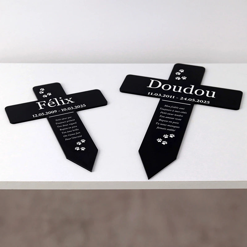 Notre croix funéraire en acrylique personnalisée est bien plus qu’une simple plaque commémorative : c’est un symbole d’amour et de gratitude envers un compagnon fidèle. Conçue spécialement pour l’extérieur, la croix funéraire pour chien ou chat est résistante aux intempéries et fabriquée en acrylique de haute qualité. L’impression personnalisée permet de créer ainsi un hommage unique et durable pour votre animal.