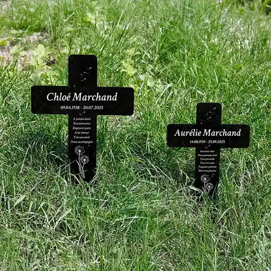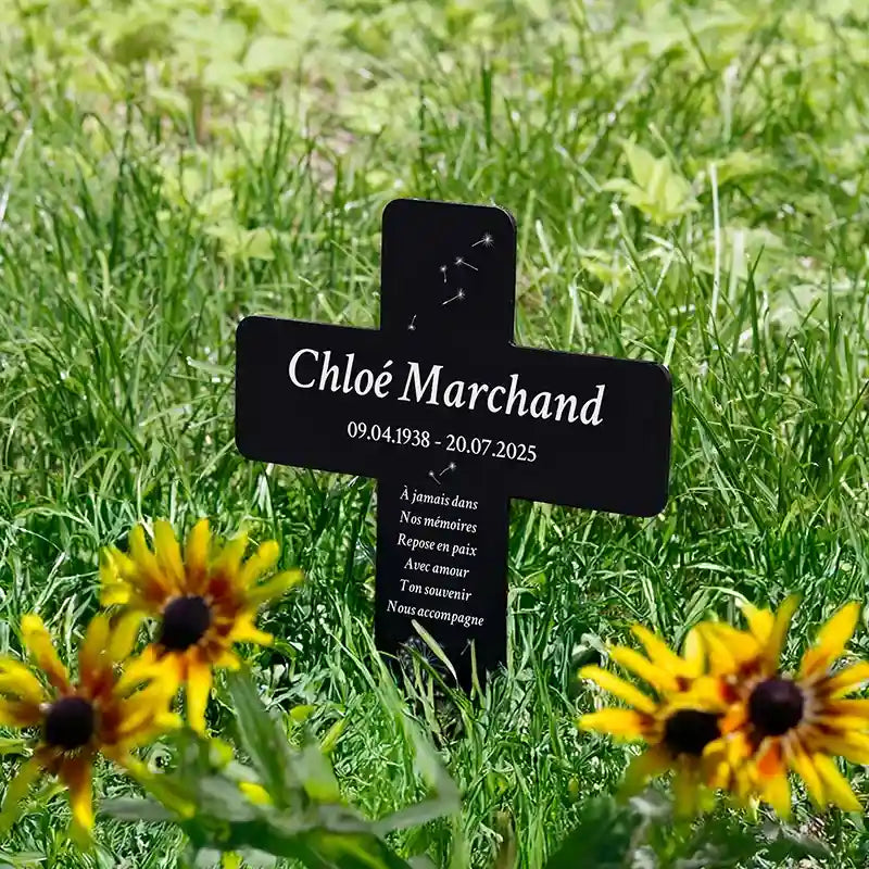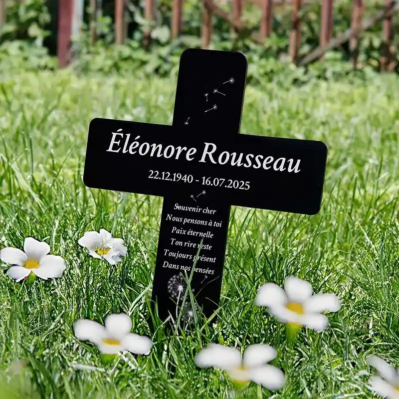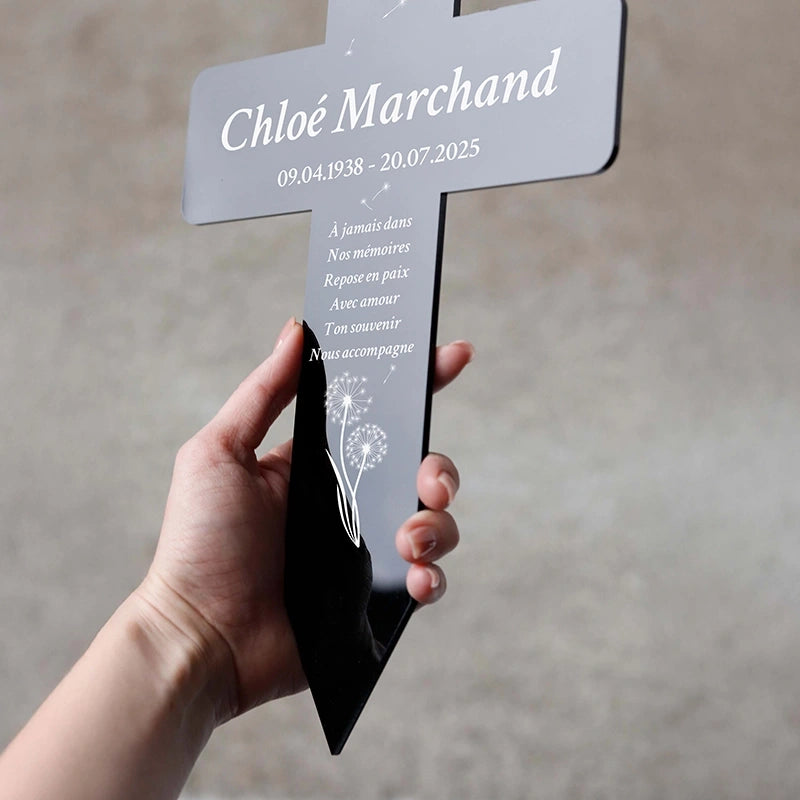 Croix funéraire personnalisée, acrylique – Ornement de tombe avec nom – Pissenlit, 2 tailles | Piquet funéraire gravé