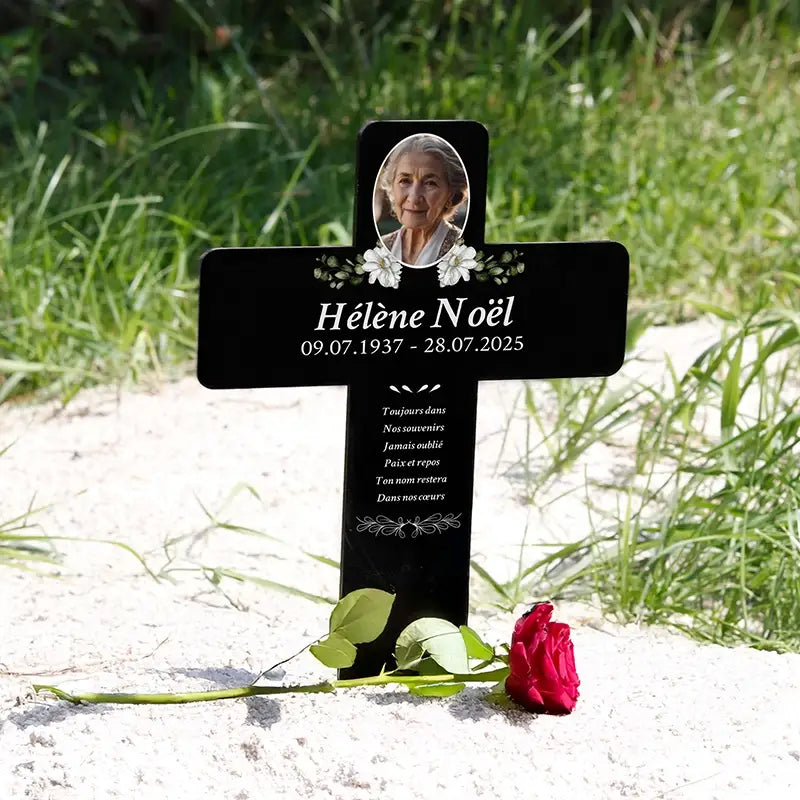 Notre croix funéraire personnalisée avec nom et photo est bien plus qu’une simple décoration de tombe – c’est un souvenir chargé d’émotion, qui capture les moments et les sentiments partagés avec la personne aimée. Fabriquée en acrylique de haute qualité, cette croix résistante aux intempéries est imprimée selon vos souhaits : nom, photo, dates de vie et message personnel. Cette personnalisation rend chaque croix unique et transforme la douleur de la perte en un hommage empreint de tendresse et de respect.